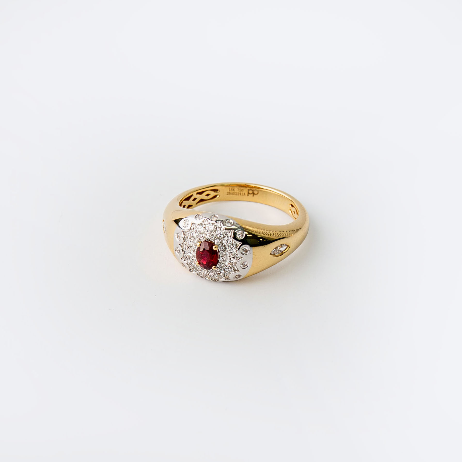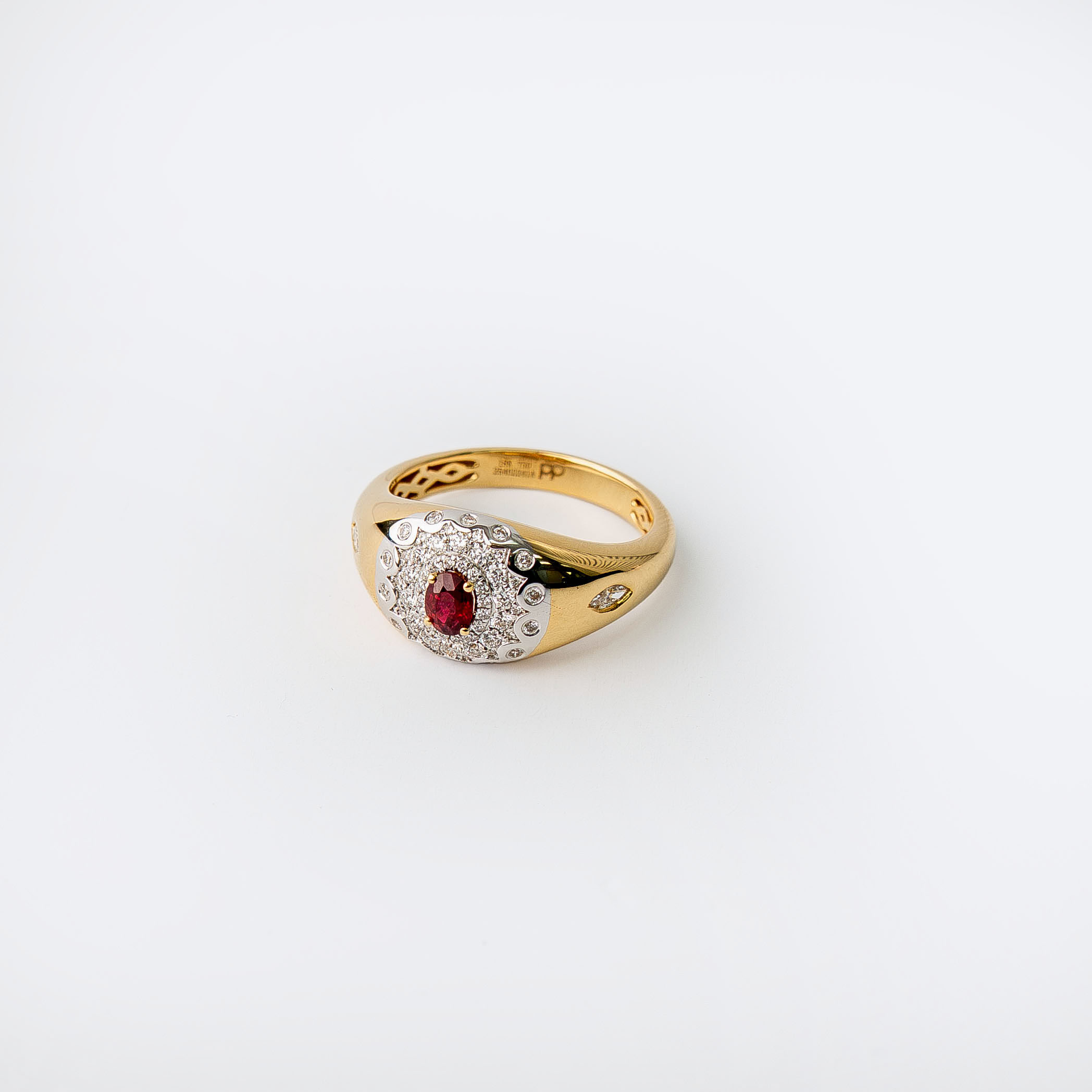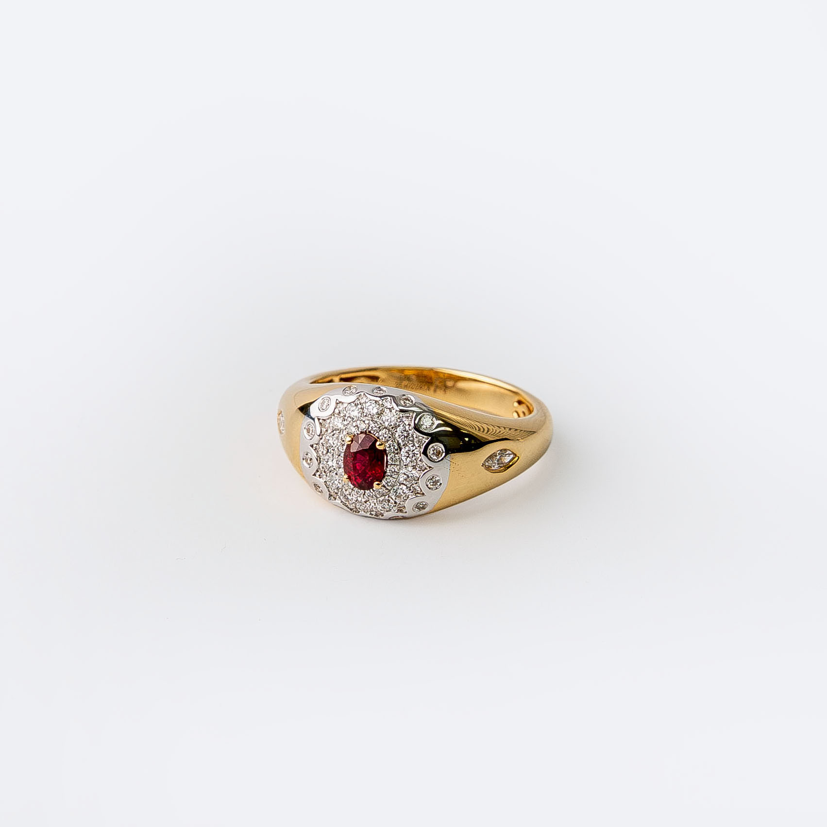 This 18kt yellow gold ring centers on a vivid oval ruby, framed by a halo of round brilliant diamonds that amplify its rich red tone. The structured gold setting gives the piece weight and presence, while subtle diamond accents along the shoulders add dimension and refinement.